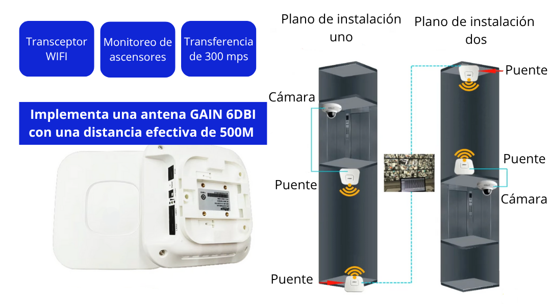Con puntos de acceso como el Dahua PFM885-I o puentes inalámbricos de largo alcance, se garantiza una conexión estable entre la cámara y el sistema de grabación ubicado fuera del ascensor, incluso en edificios altos.